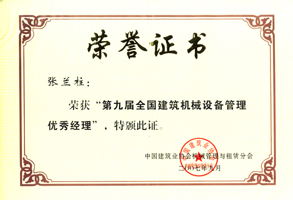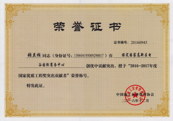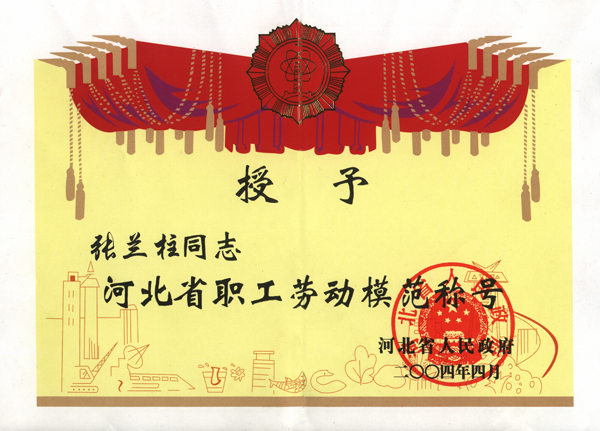 張蘭柱同志以他杰出的工作業績被各級領導機關授予:全國、河北省、保定市建筑業優秀企業經理;優秀企業家;優秀共產黨員;優秀黨務工作者;優秀思想政治工作者;安全生產、工程質量管理先進個人;河北省優秀經理管理者;河北省建設系統勞動模范;河北省勞動模范等榮譽稱號