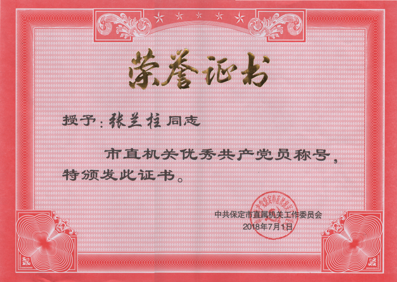黨委書記張蘭柱榮獲2017年度市直機關優秀共產黨員榮譽稱號